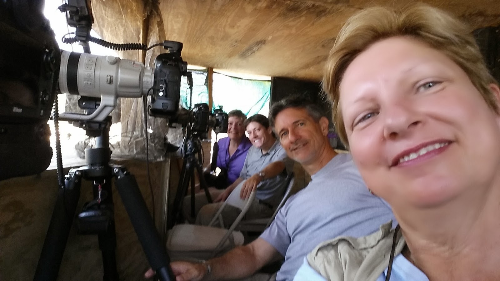 There are two morning blinds, two afternoon blinds and two raptor blinds. The equipment I suggest is if you shoot with a FX body then up to a 600 mm lens is perfect. If you shoot with a DX body then up to a 500 mm lens works a treat. I had a Nikon D800 body, which is FX, attached to my Nikon 500 f/4 lens, using it with and without a 1.4 TC. I then had a Nikon D7100, which is a DX, attached to my Nikon 300 f/4 lens. A telephoto lens with like a 70-200 mm lens would work fine too. Carlos had a Nikon D4 with the Nikon 200-400 lens, but would use it many times with a TC. Eloy had a Canon 1DX with the Canon 200-400 and built in 1.4TC. Sometimes Eloy would use his additional 1.4TC. Debby mostly used her Nikon D4 with the Nikon 500 f/4 lens with and without the Nikon 1.4TC. There is no problem setting up tripods in the blinds.